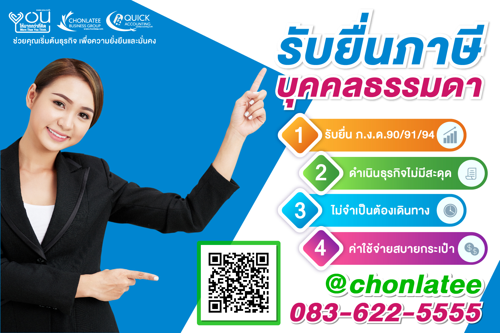 ปรึกษาการยื่นภาษีบุคคลธรรมดา ฟรีไม่มีค่าใช้จ่าย เราดำเนินงานด้านยื่นภาษี รับจดทะเบียนบริษัท จดทะเบียนบริษัท อย่างมีระบบ และคำนึงถึงความถูกต้อง เราสามารถช่วยหาทางออกในการดำเนินธุรกิจของท่านให้ประสบความสำเร็จได้ โทร 083-622-5555
